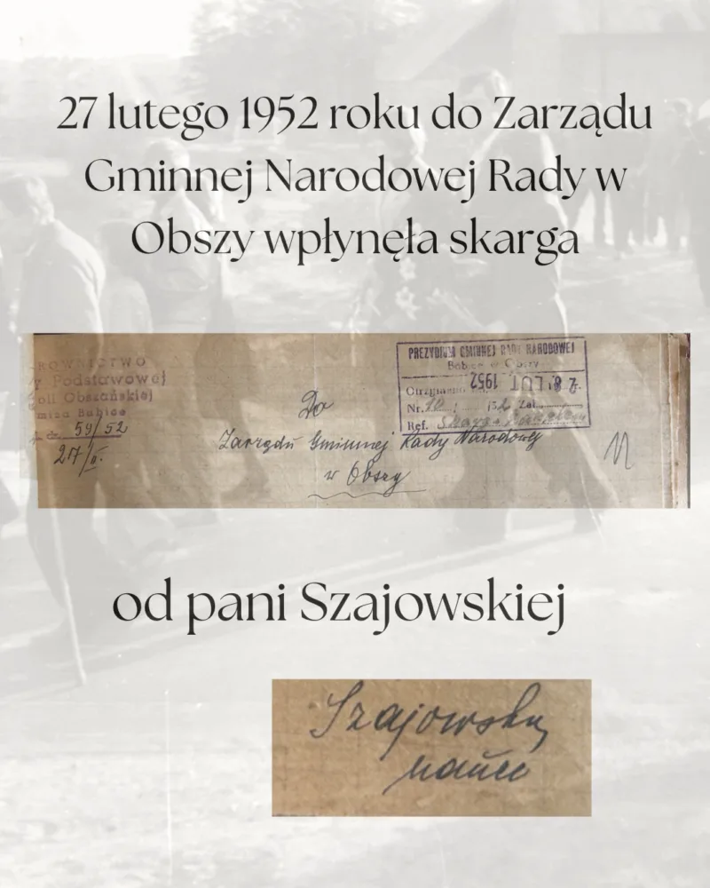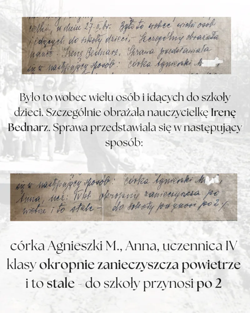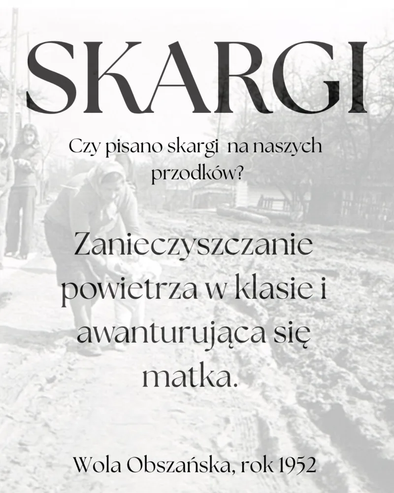 Jedna z takich skarg trafiła w 1952 roku do Zarządu Gminnej Rady Narodowej w Obszy. Sprawa dotyczyła, jak zapisano w dokumencie, „zanieczyszczania powietrza w klasie”.